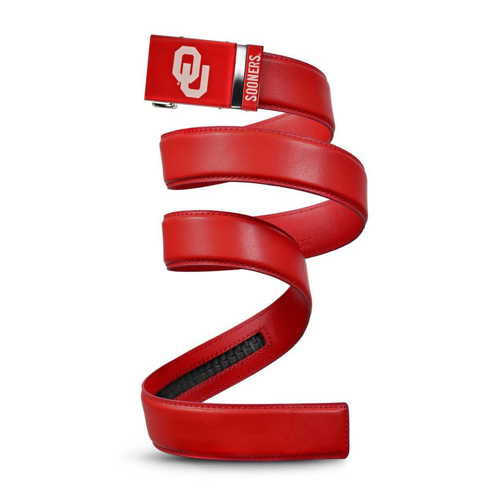 The officially licensed Oklahoma Sooners Belt features an imprinted team logo and team name on the buckle under a clear acrylic finish. Genuine leather strap with protective coating and the interior houses a special track which is part of the unique no-holes perfect fit system. The buckle can be detached from the leather strap so you can always trim it down to size.